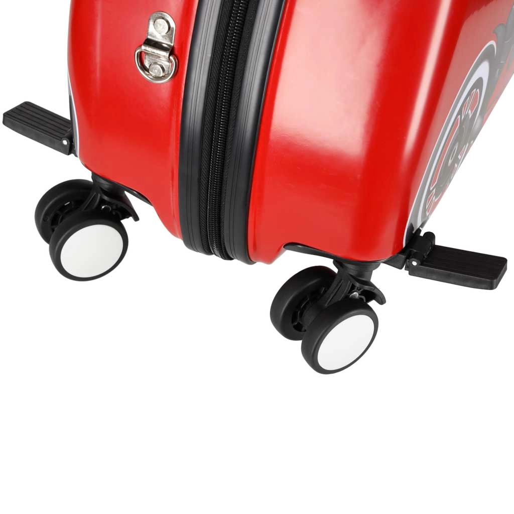 De kinderkoffer op wieltjes met motorfietsmotief maakt wachten op de luchthaven en reizen leuk. Het kind kan comfortabel op de koffer zitten en zich laten trekken, terwijl de stabiele voorste hoeken/handgrepen zorgen voor extra grip tijdens het rijden. De slimme combinatie van twee vaste achterwielen en twee voorste zwenkwielen (360°) garandeert stabiliteit en uitstekende wendbaarheid.