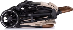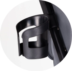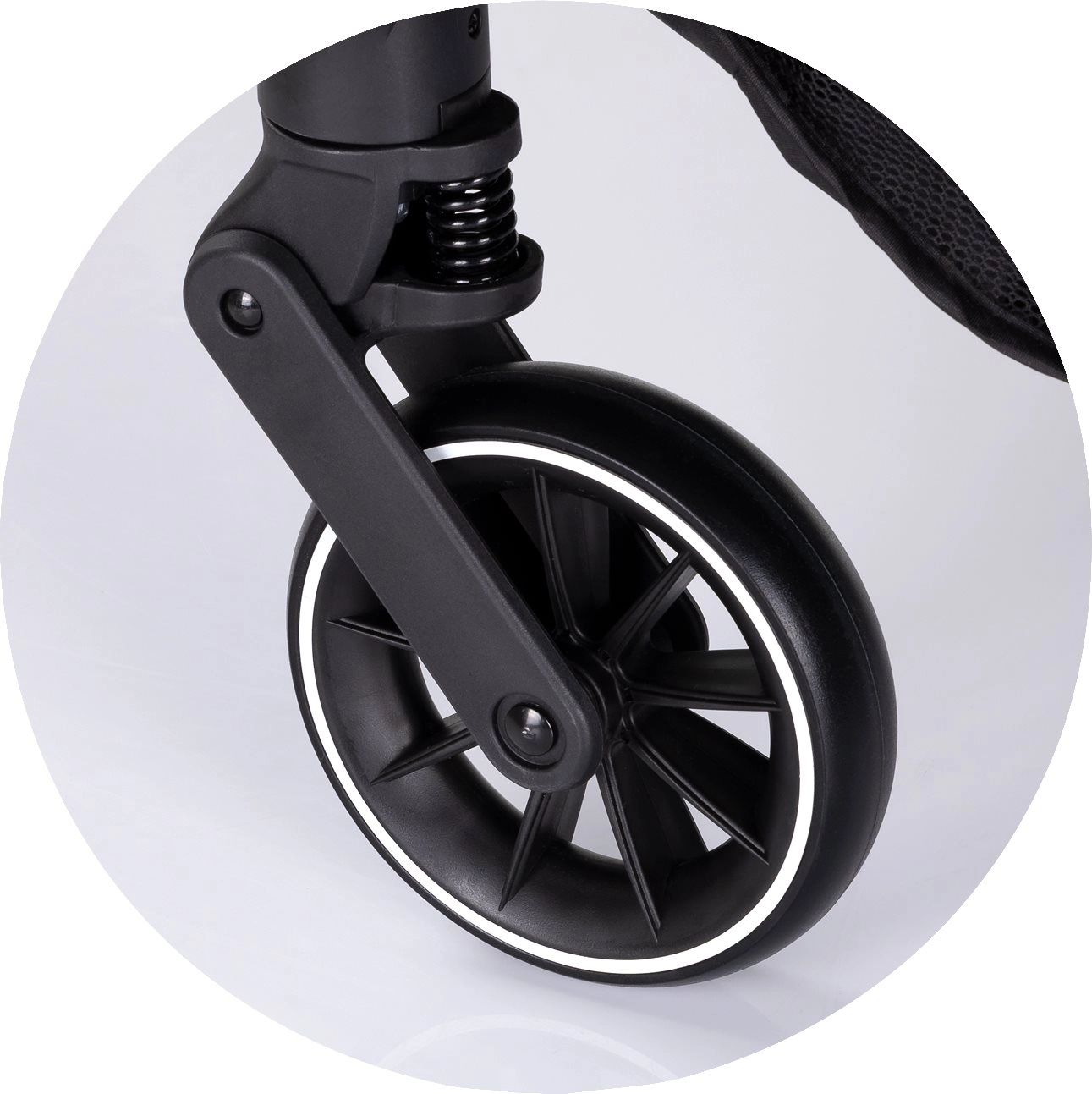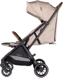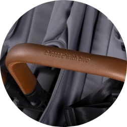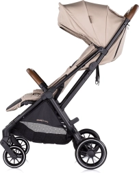 De veiligheid wordt gewaarborgd door vijfpuntsgordels met zachte padding en afneembare voorbeugels met bekleding van ecoleer. Geveerde, eenvoudig afneembare wielen en een achterrem zorgen voor een stabiele en soepele rit, ook in de stad. De praktische uitrusting wordt compleet gemaakt door een grote opbergmand, gevoerde voetenzakken, een bekerhouder en een tas met verschoningsmatje voor snel verschonen onderweg.