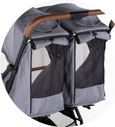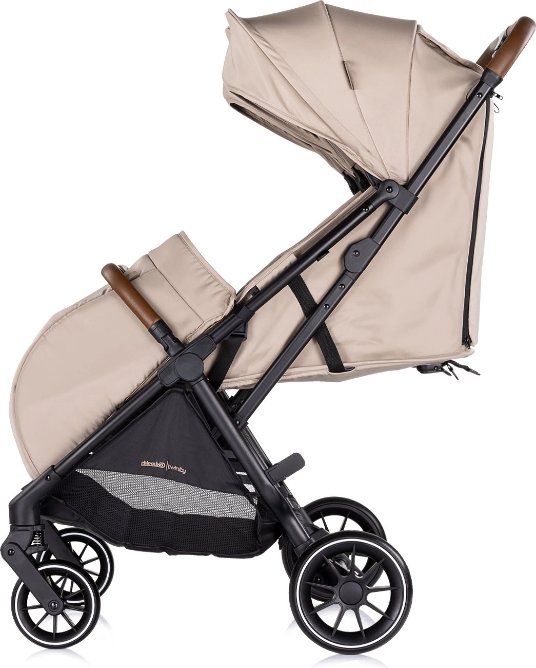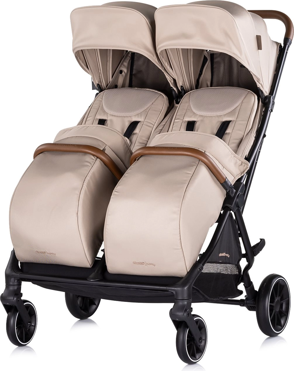 CHIPOLINO Twinity Tiramisu is een betrouwbare dubbele sportbuggy voor een tweeling of leeftijdsgenoten. Dankzij het lichte aluminium frame en het slimme 3D automatische vouwmechanisme klap je hem in een handomdraai met één hand in. Twee afzonderlijk verstelbare rugleuningen en voetsteunen zorgen voor comfort voor elk kind apart, terwijl de brede kappen met kijkvenster en zonneklep bescherming bieden tegen de elementen.