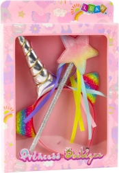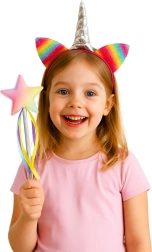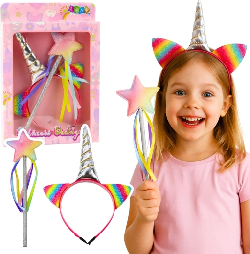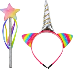 Deze betoverende accessoireset voor kleine prinsessen, feeën en eenhoornliefhebbers biedt alles wat nodig is voor creatieve verkleedpartijen en rollenspellen. De haarband met een metallic zilveren hoorn en regenboogkleurige glitters oortjes, aangevuld met een staf met ster en kleurrijke linten, verandert elk spel in een sprookjesvoorstelling.