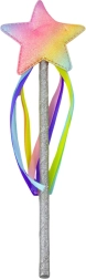 Lichte staf met glinsterend handvat, een ster in regenboogverloop en kleurrijke linten voor betoverende effecten tijdens het spelen.