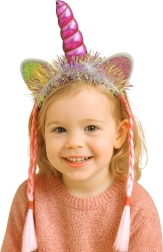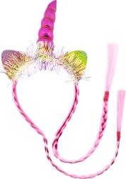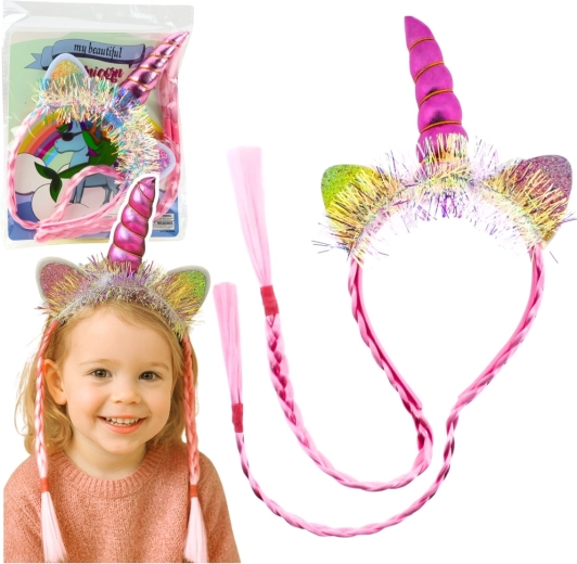 Magische roze haarband in eenhoornstijl met hoorn, oortjes en lange vlechten, ideaal voor kinderen en volwassenen. Zit perfect dankzij de universele maat, is comfortabel om te dragen en geeft elke outfit een magische uitstraling – voor feestjes, fotoshoots, carnaval en alledaagse flair.