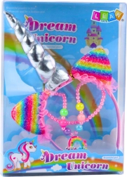Magische set voor kleine sprookjesliefhebbers: een haarband met een glinsterende zilveren hoorn en regenboogoorjes, aangevuld met een kleurrijke kralenketting. Ideaal voor verkleden, kinderfeestjes, fotoshoots en creatief rollenspel. De lichte en comfortabele haarband, de elastische ketting en pasteltinten met glitters toveren een betoverende eenhoornlook tevoorschijn.
