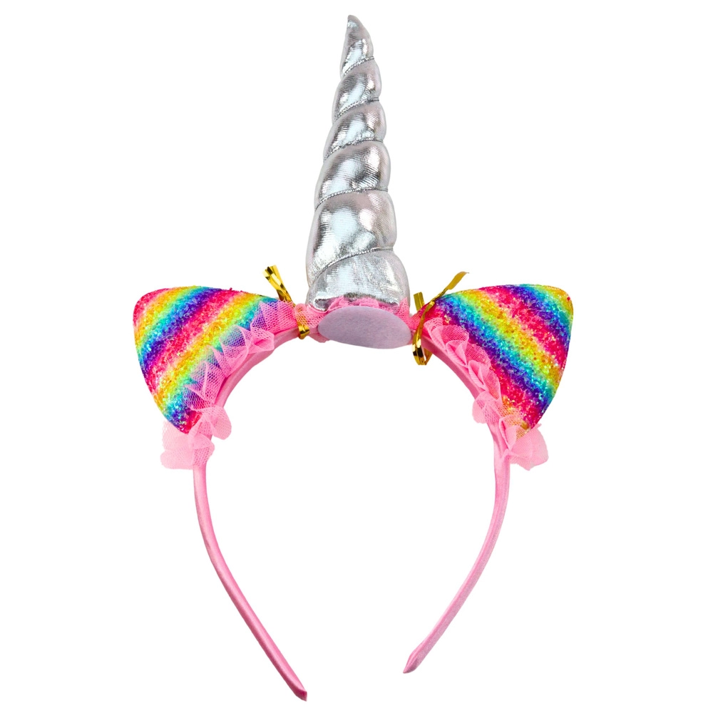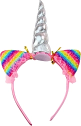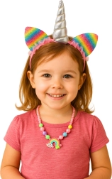 De set DREAM UNICORN brengt kinderen plezier in verkleden en fantasie. De haarband met regenboogkleurige paillettenoorjes en een glanzende zilveren hoorn samen met de kleurrijke kralenketting creëert in een handomdraai een sprookjesachtige outfit. Perfect voor carnaval, een verjaardagsfeest, een gemaskerd bal of een familieshoot.