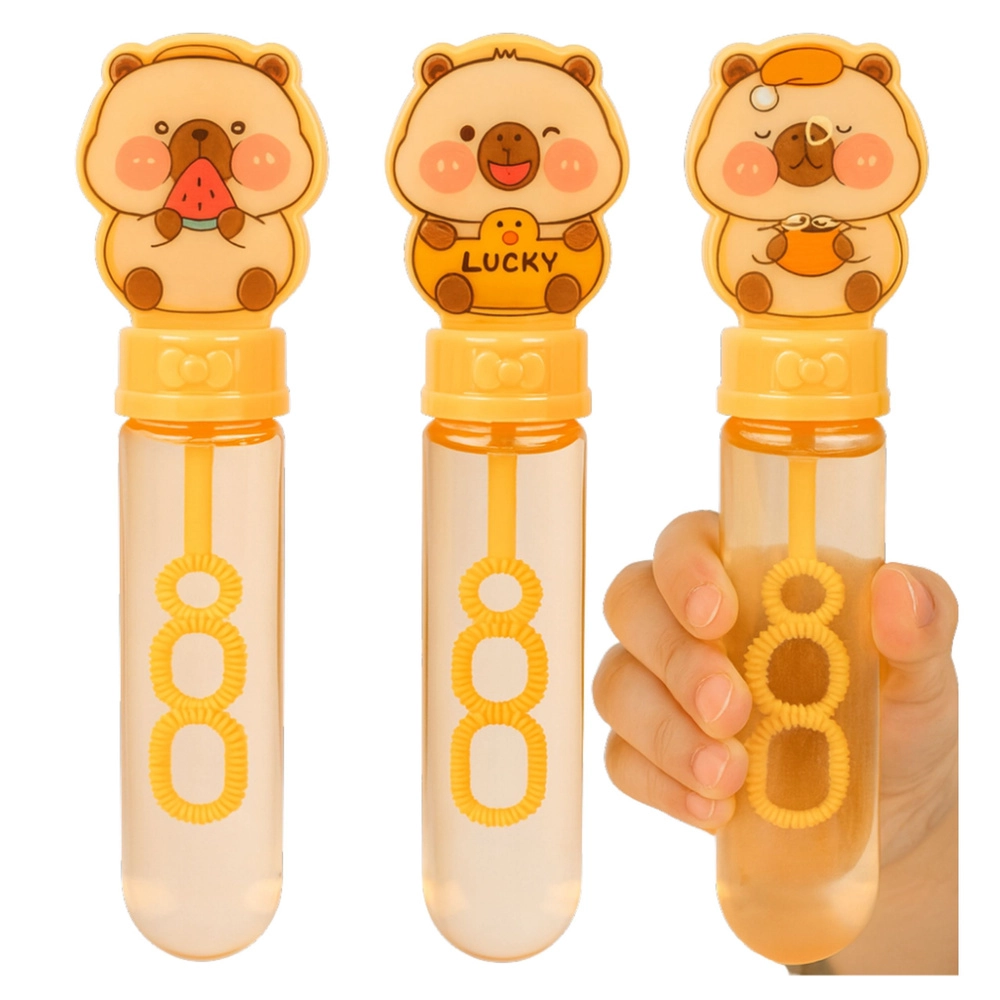 Schattige bellenblaas met capibara-motief en een inhoud van 35 ml, goed voor uren speelplezier binnen en buiten. Dankzij de driedubbele ring maak je met één zwaai veel grote, kleurrijke bellen. Het lichte, makkelijk vast te houden buisje met transparante behuizing laat je het vloeistofniveau controleren – ideaal voor de tuin, speeltuin en verjaardagsfeestjes.