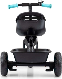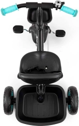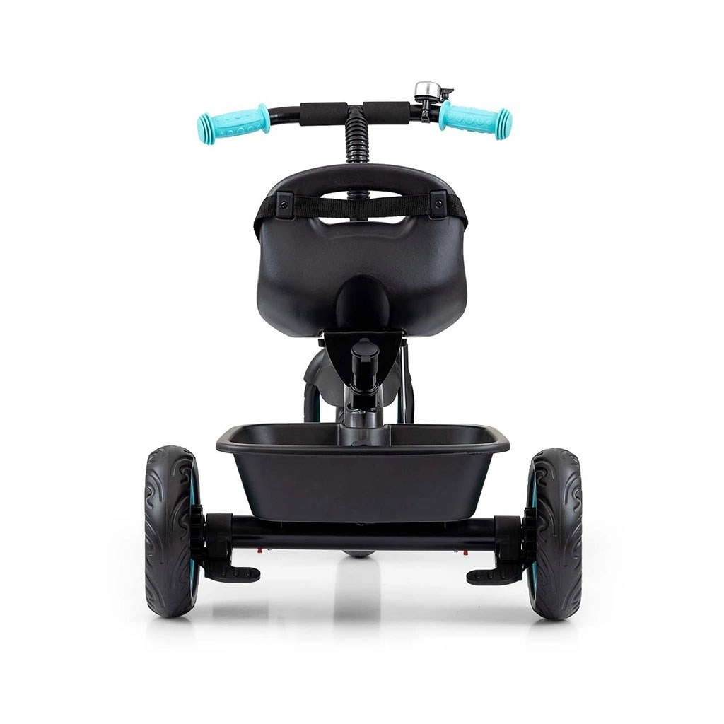 De 3-punts gordels met beschermers houden het kind stevig in het zadel, terwijl het voorste mandje en de achterste bak ruimte bieden voor speelgoed en kleine spullen.
