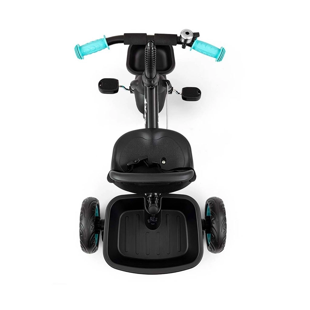 Voor extra comfort kunnen de pedalen worden geblokkeerd of vrijgegeven op het voorwiel: het kind kan trappen, of u kunt sturen met de duwstang. 3-punts veiligheidsriemen met beschermers houden de kleine rijder veilig in het zadel, terwijl het voorste mandje en de achterste bak favoriete speeltjes meenemen. De bel op het stuur verhoogt zowel de veiligheid als het plezier.