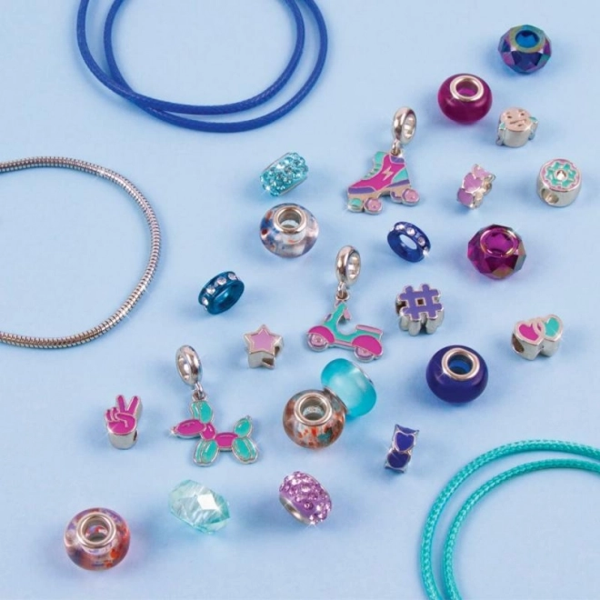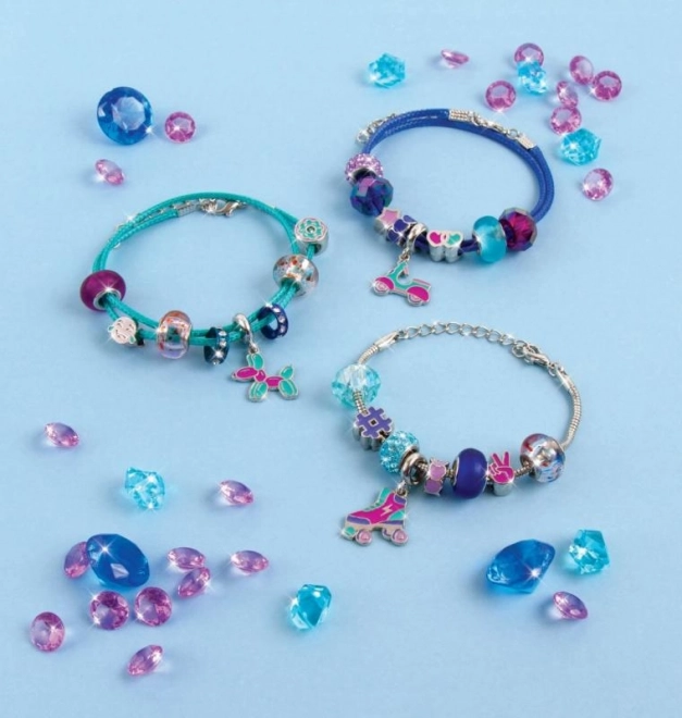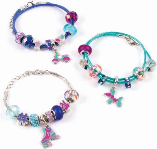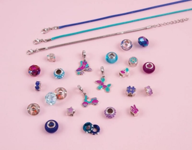 Een mix van zilverkleurige, blauwe en paarse kralen wordt aangevuld met speelse bedels, waarmee je een uniek sieraad op maat maakt.