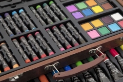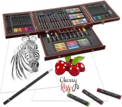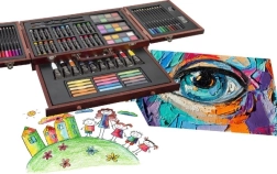 Complete tekenset in een elegante houten koffer voor beginnende en gevorderde kunstenaars. Bevat een brede selectie hulpmiddelen voor tekenen en schilderen om je ideeën tot leven te brengen. Je vindt er acrylverf, waterverf, zachte en oliepastels, kleur- en grafietpotloden, penselen en andere essentials – alles overzichtelijk geordend en gemakkelijk mee te nemen.