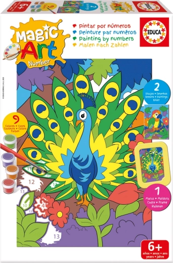 De set Educa schilderen op nummer – pauw en papegaai laat je stap voor stap genummerde delen inkleuren volgens de meegeleverde voorbeeldkaart. Elk nummer op het canvas komt overeen met een specifieke kleur, zodat het resultaat altijd indrukwekkend en met vertrouwen uitgevoerd is.