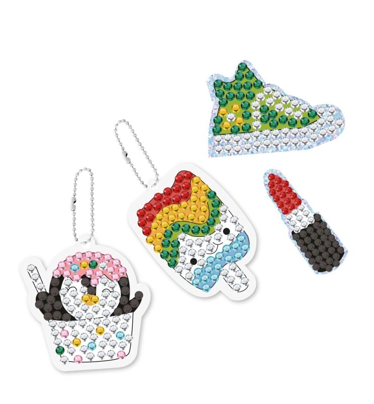 Klaar gemaakte hangers bevestig je makkelijk aan een rits, sleutels of rugzak; stickers versieren schriften, dagboeken en accessoires. Ideaal cadeau voor iedereen die van glans en knutselen houdt.