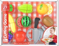 De set bevat een praktische snijplank en een veilig plastic mes, zodat kinderen op een veilige manier kunnen doen alsof ze koken en maaltijden bereiden. Het spel bevordert op natuurlijke wijze de fijne motoriek, hand-oogcoördinatie en ondersteunt het leren van kleuren en vormen.