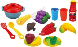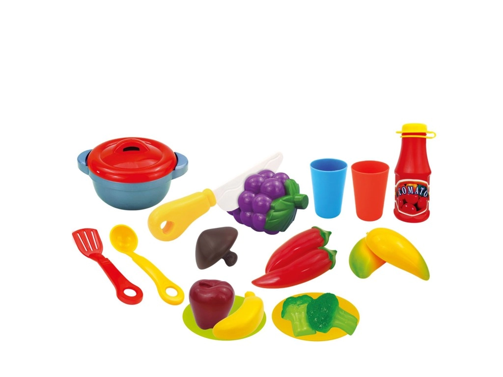 Ideaal voor kinderkeukens, kleuterscholen en speelhoeken. De set is licht, gemakkelijk mee te nemen en snel op te ruimen direct in de mand.