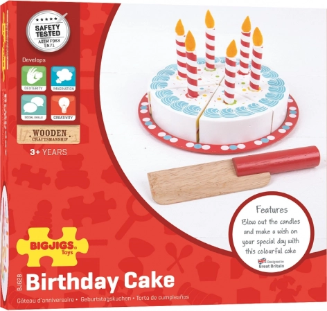 Ontdek de magie van feestvieren met onze houten verjaardagstaart om te snijden van Bigjigs Toys. Deze speelgoedset is ideaal voor jonge kinderen die de wereld om hen heen ontdekken via speelse en interactieve activiteiten. De taart is groot genoeg voor een speelgroep van zes en bevat ook een houten mes voor eenvoudig snijden.