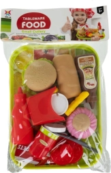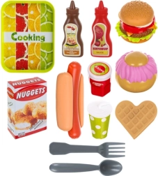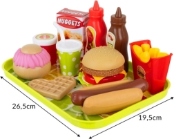 - dienblad, ketchup, chocoladesaus, hotdogbroodje, worst, bestek (lepel, mes, vork), nuggets, jam, bekertje met rietje, frietdoosje, 5× frietjes, 2× burgerbroodjes, wafel, ui, sla, tomaat, burger, kaas, cupcake, topping