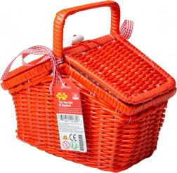 Betoverend theeservies in een rode rieten mand brengt speelplezier. Bevat vier kopjes, schoteltjes, een pot met lepels, ideaal voor kindertheefeestjes thuis en onderweg.