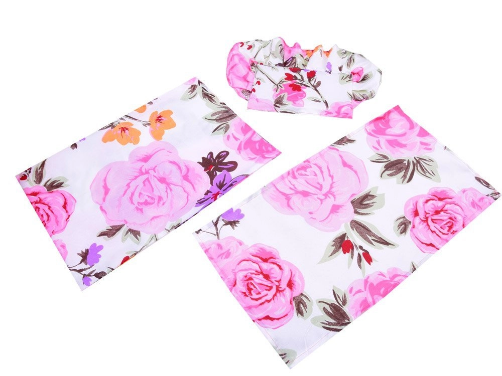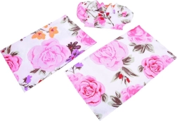 Inclusief zacht kussentje en deken met een kleurrijk bloemenpatroon – alles op elkaar afgestemd en klaar voor poppen en knuffels.