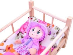 - Houten poppenbed, kussentje, deken (pop niet inbegrepen)