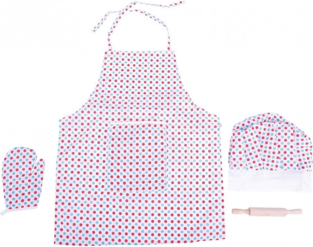 Een comfortabel schort met gekleurde stippen beschermt kleding tijdens spel en echt bakken. De verstelbare muts met klittenband past zich eenvoudig aan de hoofdomtrek aan en blijft de hele dag comfortabel zitten.