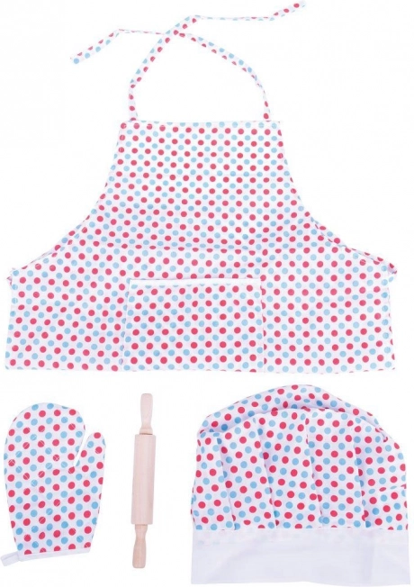 Stijlvolle kinder-kookset met een gestippeld schort van Bigjigs Toys die elk kookspel tot leven brengt. Bevat een schort met stippen, koksbaret met klittenband, ovenwant, houten deegroller en metalen uitsteekvormpjes – ideaal voor rollenspel en begeleid bakken.