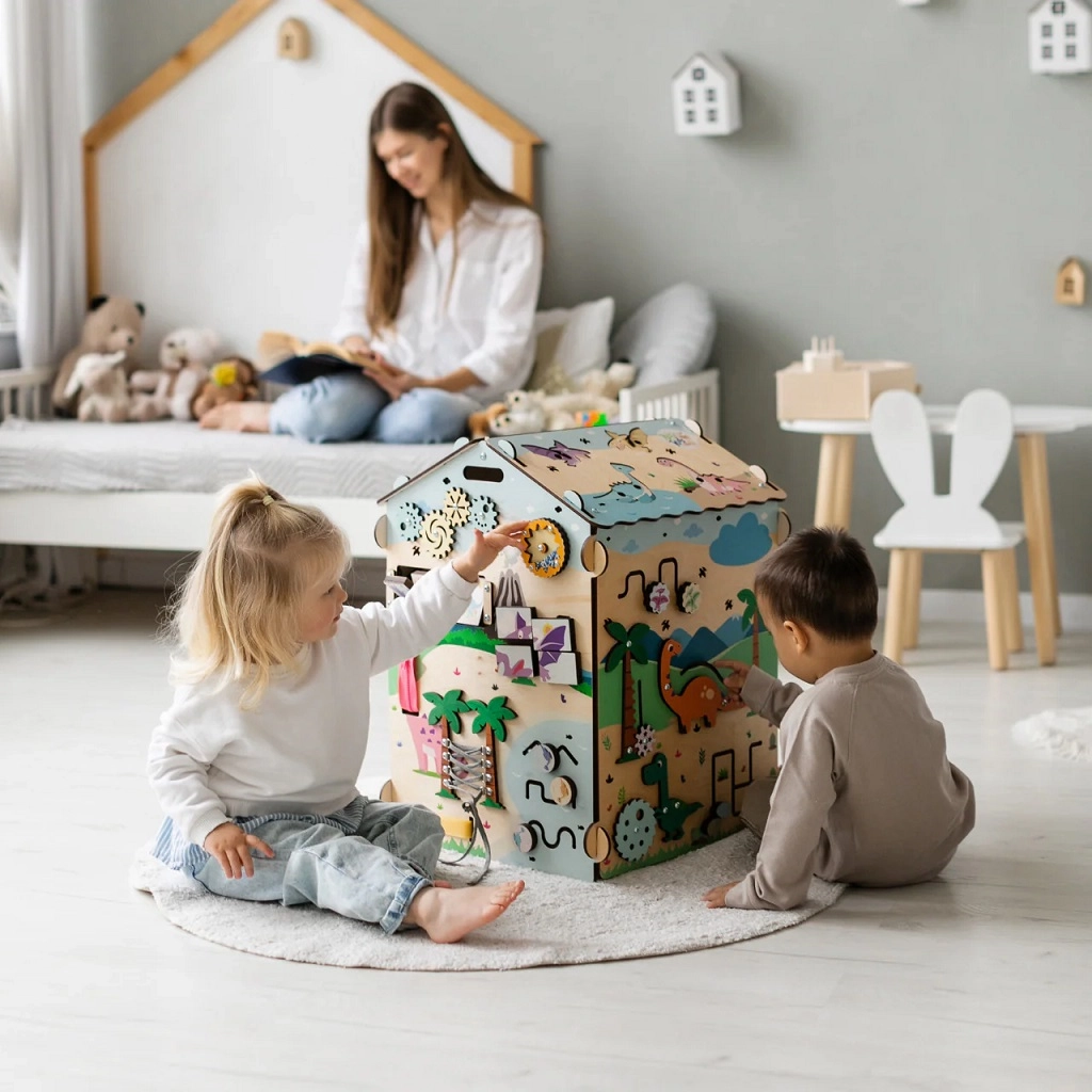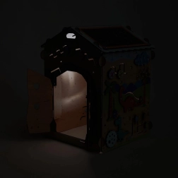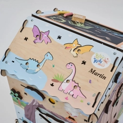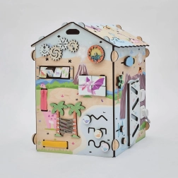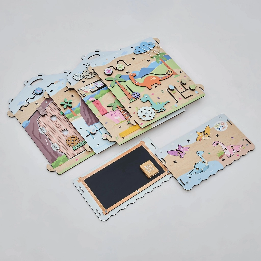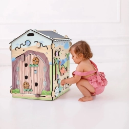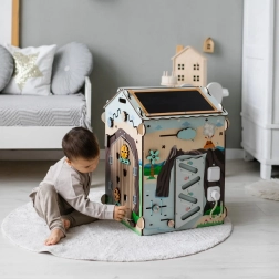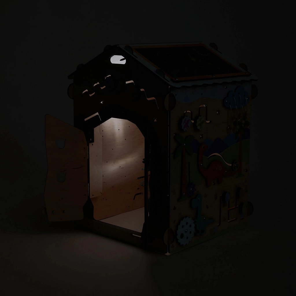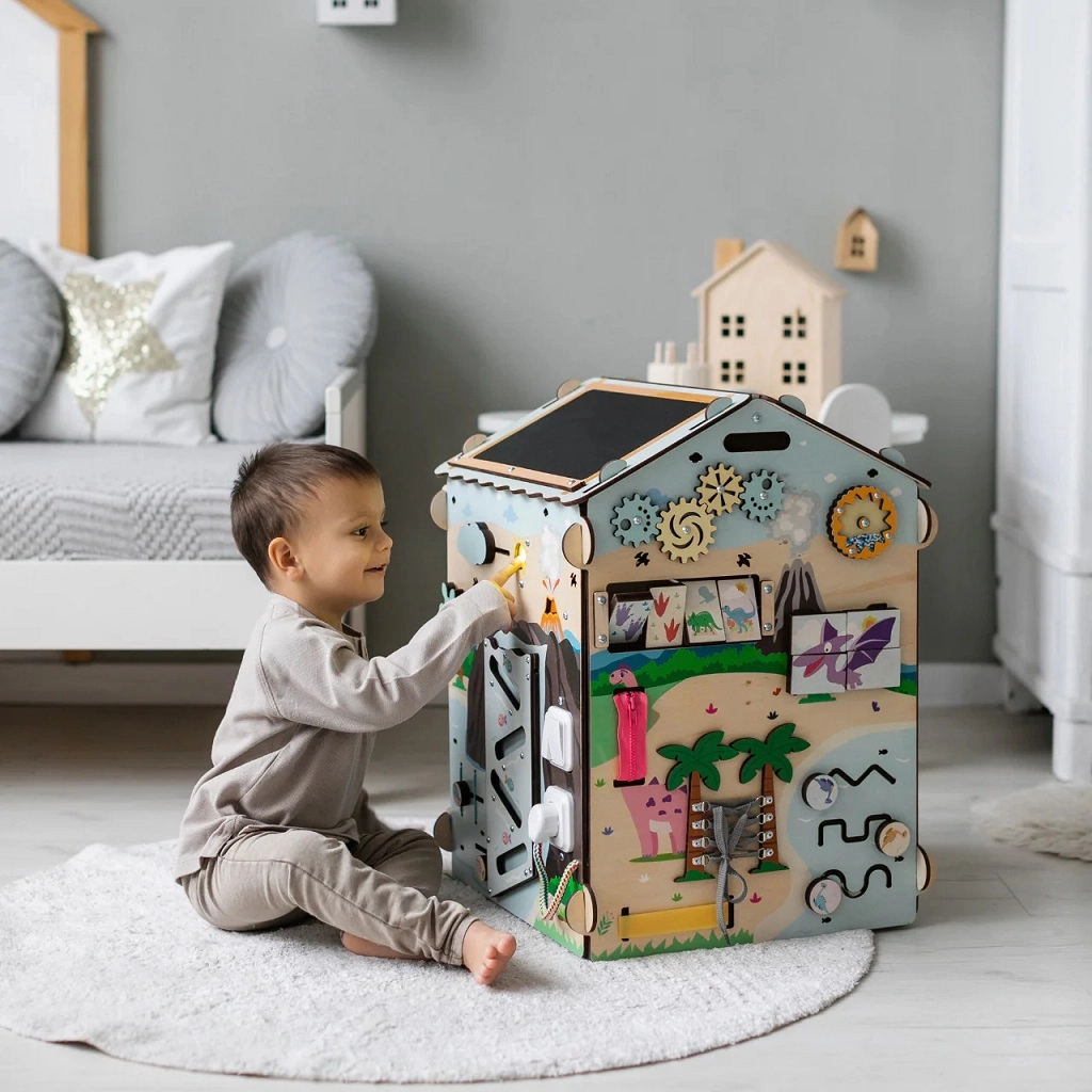 Ontdek het leuke en leerzame houten Montessori huisje van BusyKids met DINO-thema, met ongeveer 30 interactieve elementen voor de ontwikkeling van fijne motoriek, oog-handcoördinatie en logisch denken. De stabiele constructie van berkenmultiplex, veilige lakken op waterbasis, lichteffecten (vulkaan en zon) en een krijtbord op het dak maken dit huisje ideaal voor peuters en kleuters.
