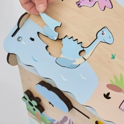 Tandwielen, schuivers, sloten, veters en andere slimme mechanismen stimuleren spelenderwijs de fijne motoriek, oog-handcoördinatie en het logisch denken.