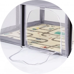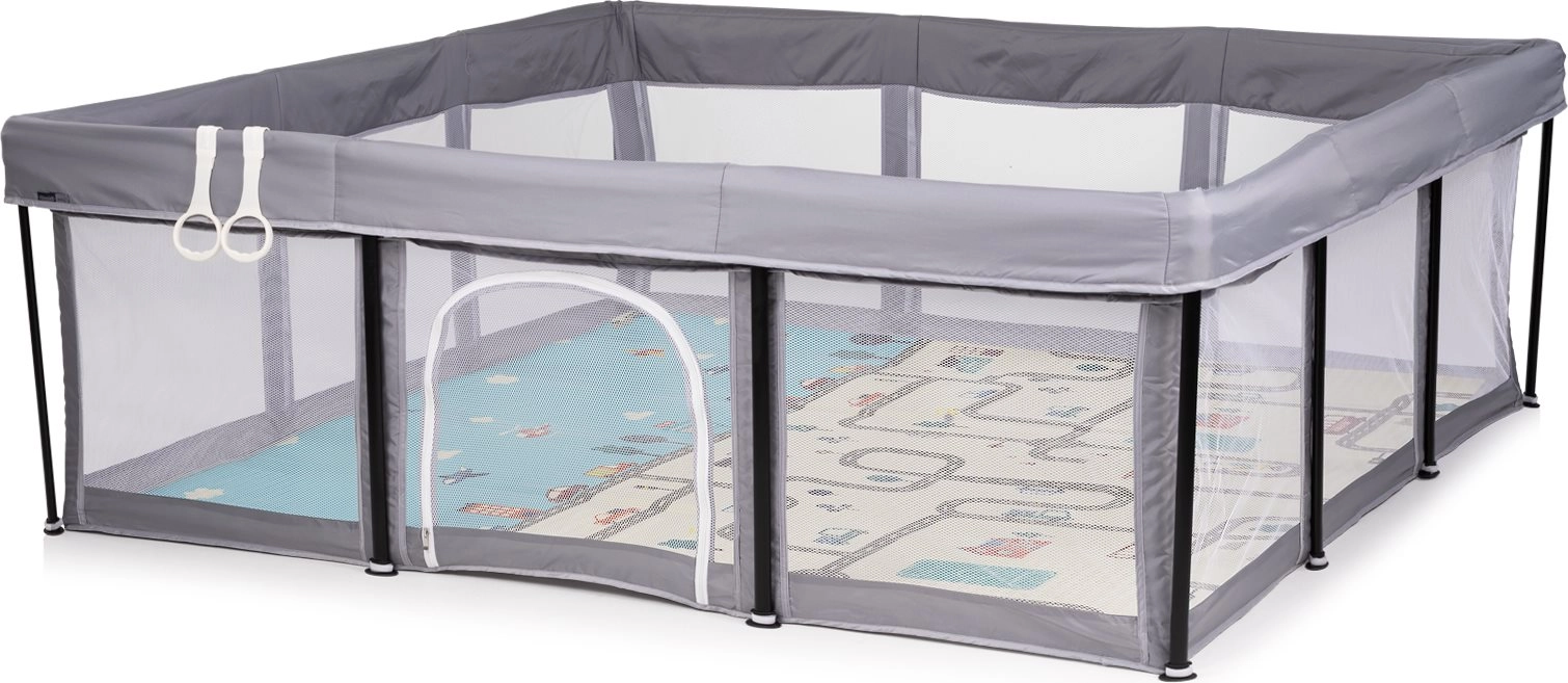 Praktische en veilige kinderbox in een elegante grijze kleur met ruime plek om te spelen en te ontspannen. Dankzij de ademende mesh-panelen, rits aan de zijkant en stabiel metalen frame heb je altijd goed zicht op je kind en ben je zeker van de veiligheid. Hij is licht en eenvoudig te monteren en in de verpakking vind je 2 grijpringen om staand trainen te ondersteunen.