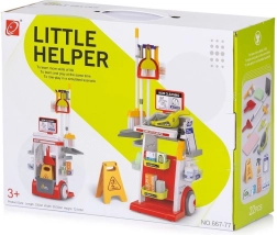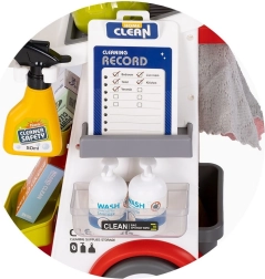 De praktische kar met haken en schappen biedt plaats aan mop, bezem, handveger, stoffer en spray. Kinderen leren eenvoudig organiseren en na het spelen alles op te ruimen.