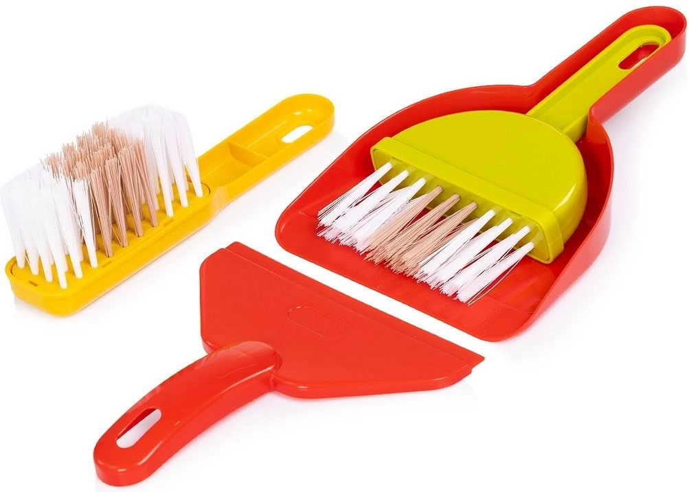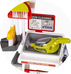 De set bevat een uitgebreid assortiment accessoires: stofzuiger, mop, bezem, handveger en stoffer, sprayfles, spons en doekjes, eventueel ook een waarschuwingsbord en een mand. Alles is afgestemd op kinderhanden voor een veilige grip en eenvoudig opbergen op de kar. Kwalitatieve materialen garanderen een lange levensduur, ook bij frequent gebruik.