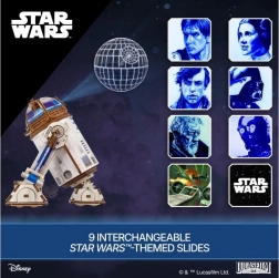 De legendarische droid R2‑D2 komt tot leven in een houten model dat het iconische STAR WARS‑design trouw weergeeft. Dankzij het opwindmechanisme rijdt de droid na het omzetten van de “start/stop”‑hendel echt vooruit en vertoont hij een vloeiende beweging, terwijl de LED‑projector kleurrijke scènes toont uit een sterrenstelsel hier ver, ver vandaan. De dia’s zijn veilig in het lichaam van de droid opgeborgen en kunnen eenvoudig worden verwisseld met het meegeleverde hulpmiddel.