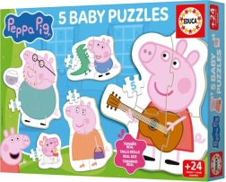 Een leuke set baby puzzel 5-in-1 met motieven van Peppa Big, speciaal ontworpen voor kinderen vanaf 24 maanden. Bevat progressieve puzzels van 2 tot 5 stukjes met grote en stevige stukken voor gemakkelijk vastpakken. Ondersteunt de psychomotorische ontwikkeling, aandacht, verbeeldingskracht en de nieuwsgierigheid van kinderen.