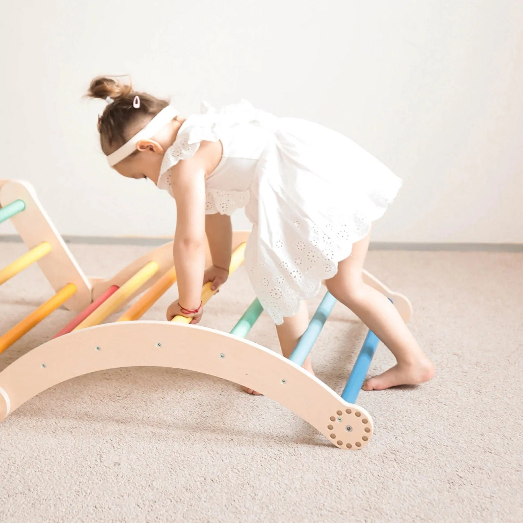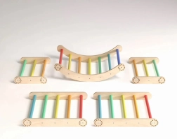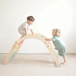 De set bestaat uit twee klimdriehoeken (een grotere en een kleinere) en een balansboog, die eenvoudig tot verschillende vormen kunnen worden verbonden – brug, tunnel, ladder of huisje. De natuurlijke structuur van berkenmultiplex in combinatie met zachte regenboogtinten geeft het speelgoed een moderne uitstraling en motiveert kinderen tot actieve beweging.