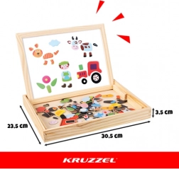 Creatief dubbelzijdig bord van KRUZZEL voor kinderen vanaf 3 jaar, met een witte magnetische zijde voor het leggen van vormen en schrijven met stift en een zwarte krijtzijde om te tekenen. In de set zitten 108 kleurrijke magnetische onderdelen, een whiteboardstift, krijtjes, een spons en een praktische houten doos voor opbergen. Geweldig hulpmiddel voor de ontwikkeling van de fijne motoriek, logisch denken en creativiteit zonder schermen.