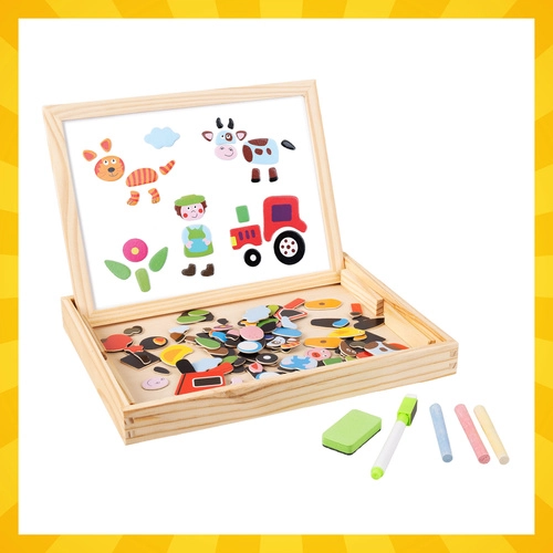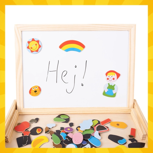 Ontdek een slimme speelgoedset die meegroeit met uw kind. Het dubbelzijdige bord biedt twee werelden vol plezier: een witte magnetische zijde voor het leggen van dieren, figuurtjes en voertuigen en voor schrijven met whiteboardstift, en een zwarte krijtzijde voor vrij tekenen. Alles is opgeborgen in een compacte houten doos die ook als standaard fungeert.