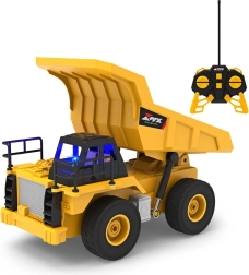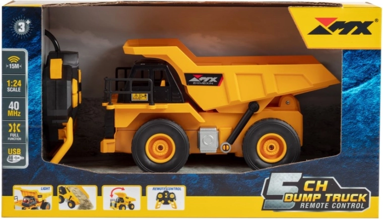 Realistische RC kiepwagen in schaal 1:24 met gedetailleerde afwerking en een volledig functionele laadbak. Besturing op 40 MHz, bereik 10–15 m, 5-kanaals controller, lichteffecten en een oplaadbare 3,7 V batterij zorgen voor een leuke en soepele rit met een snelheid van 2–3 km/u.