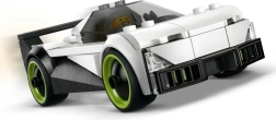 Laag profiel, zwart-witte kleurstelling en neongroene velgen. De openslaande cockpit laat je een minifiguur plaatsen en vol gas de baan op gaan.