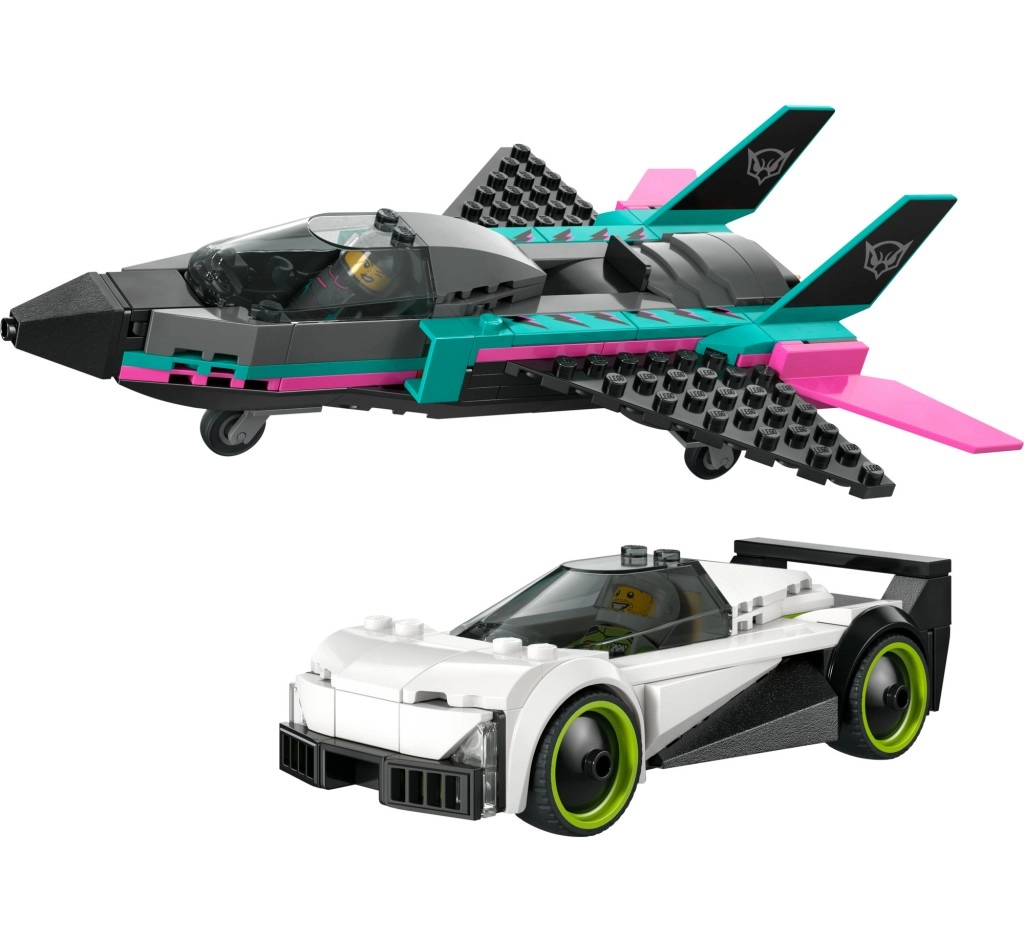 Deze dynamische set combineert snelheid en creativiteit: een elegante witte racewagen met neongroene velgen en een aerodynamische straaljager in een zwart-turkoois-roze kleurencombinatie. Openslaande cockpits maken het eenvoudig om minifiguren te plaatsen en vormen het decor voor spannende races en luchtshows.