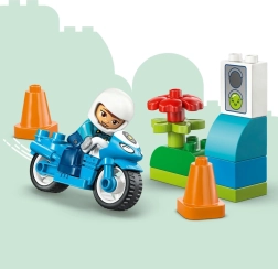 Ontdek de leuke en leerzame LEGO DUPLO set voor de allerkleinsten: een blauwe politiebrommer met een politieagente, verkeerskegels en een eenvoudig accessoire voor rollenspellen op de weg. De grote stenen zijn veilig en gemakkelijk vast te pakken en stimuleren de fijne motoriek, creativiteit en het spelenderwijs leren van verkeersregels.