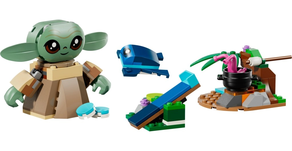 De set bevat een kleine speelomgeving met een vuurplaats en een zwarte pot, marshmallows om te roosteren, twee blauwe macarons (één past in Grogus buik), een Sorgan-kikker met katapult en kleine accessoiremodellen. Een eenvoudige geïllustreerde handleiding en de LEGO Builder-app met tools om het model te zoomen en te draaien helpen kinderen hun fijne motoriek en zelfvertrouwen bij het bouwen te ontwikkelen.