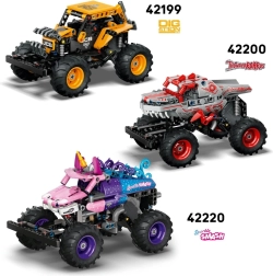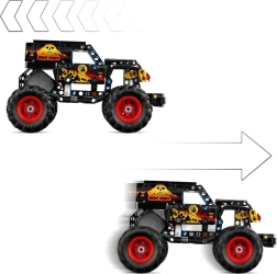 Dit model uit de LEGO Technic reeks vangt perfect de sfeer van de Monster Jam‑arena. De ene zijde van de truck straalt met vuurmotieven en rode velgen, de andere kant is uitgevoerd in ijzig blauw met blauwe wielen. Dankzij de opwindmotor hoef je alleen maar naar achteren te trekken en de truck schiet naar voren voor sprongen, drifts en coole stunts – en dat alles zonder batterijen.