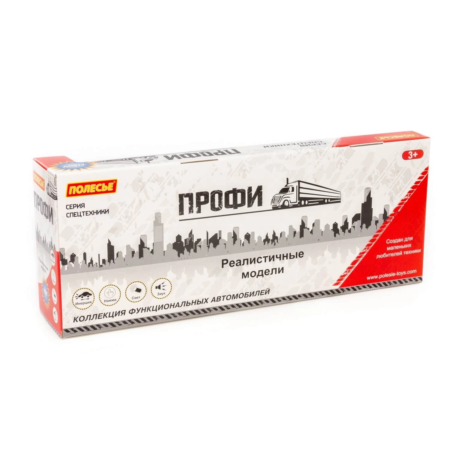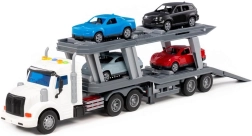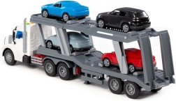 Deze gedetailleerde autotransporter bootst een echte vrachtwagen natuurgetrouw na: hij heeft een meerlagig platform, kantelbare oprijplaten en een stabiel chassis met vijf paar wielen op metalen assen. De cabine is uitgerust met 4 knoppen voor het activeren van licht- en geluidsignalen, die de speelbeleving versterken.