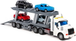 Realistische autotransporter voor kleine chauffeurs met licht- en geluidseffecten, functionele laadkleppen en vier meegeleverde autootjes. De robuuste constructie met vijf paar wielen op metalen assen zorgt voor soepel rijden en een lange levensduur. Ideaal speelgoed voor kinderen die van auto’s, laden en vervoeren houden.