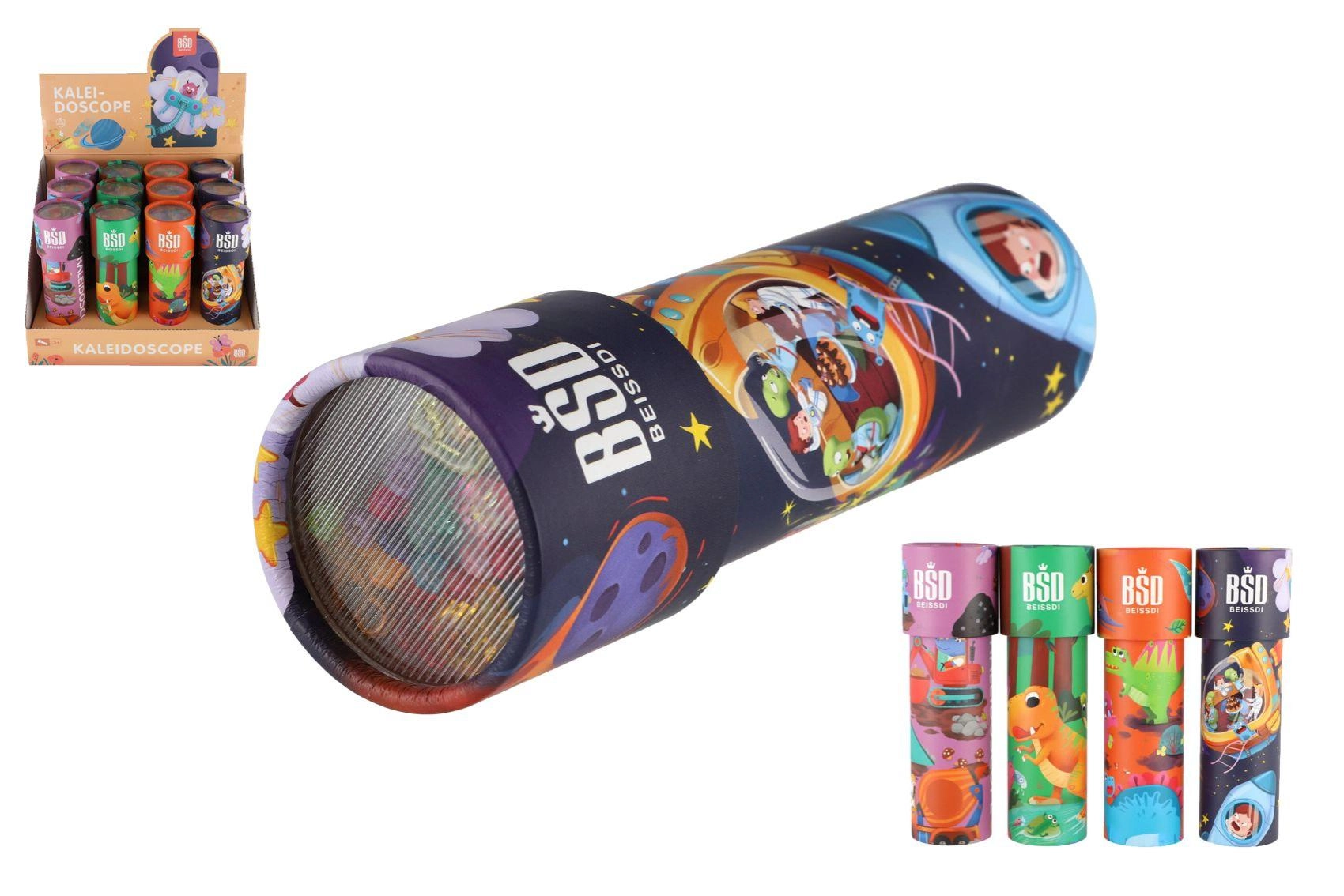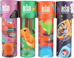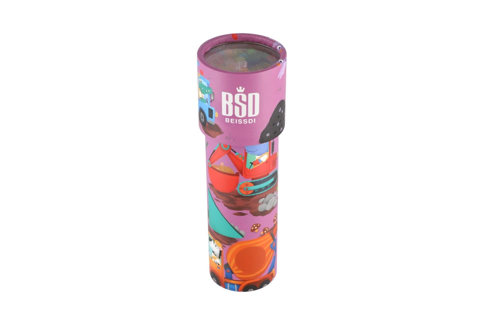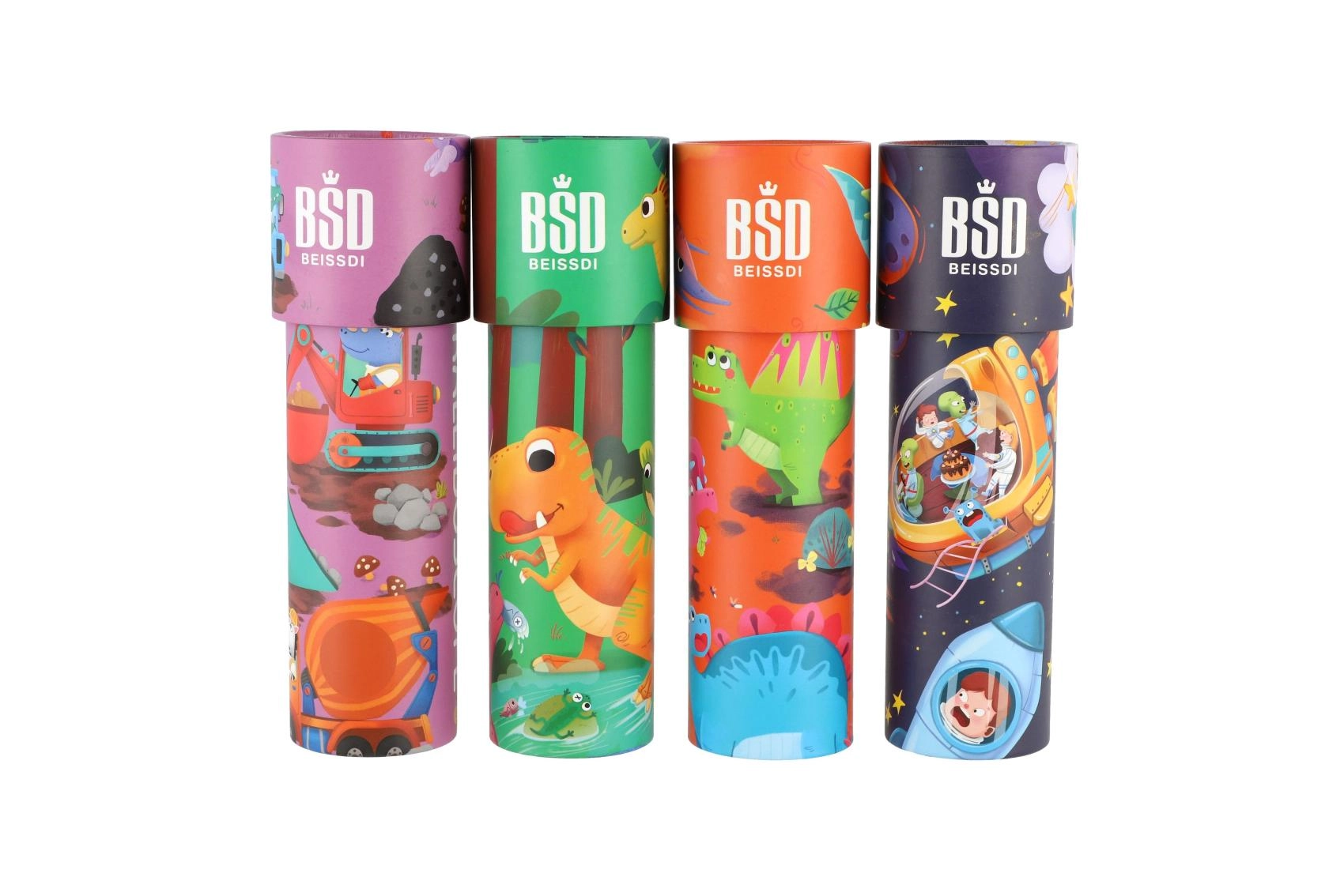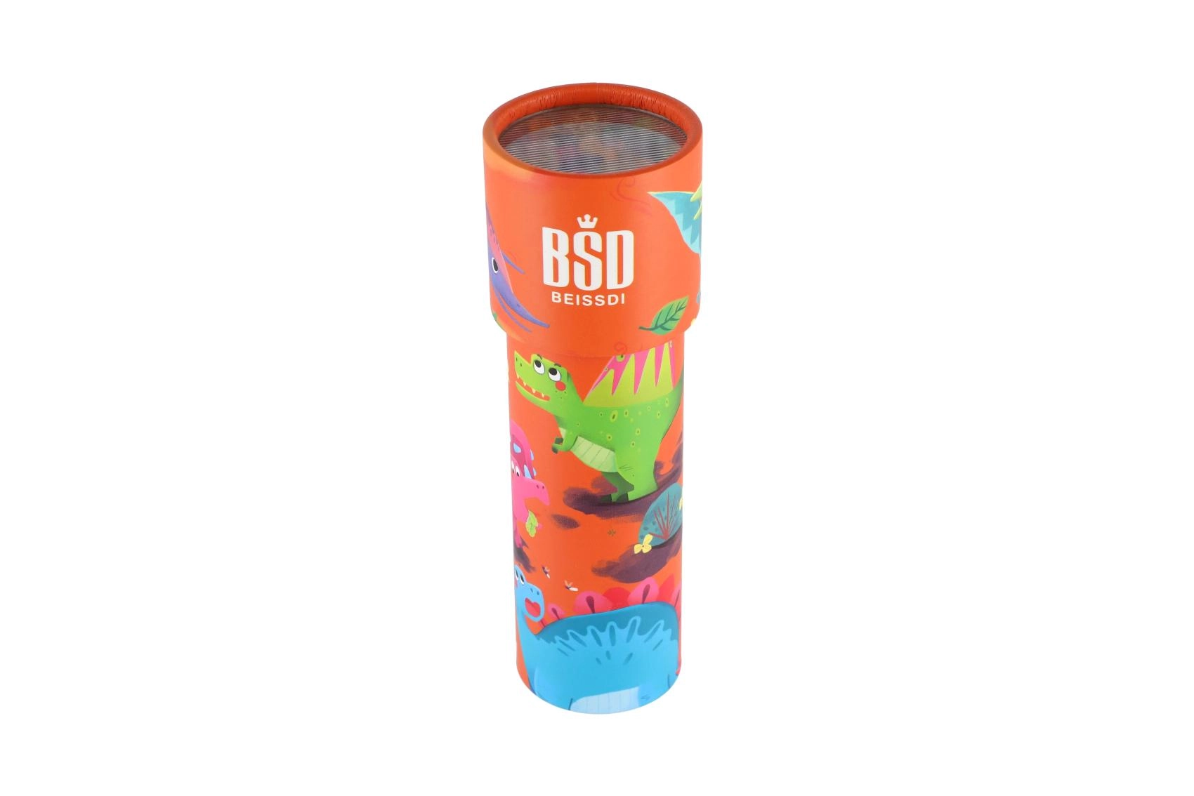 Speelse illustraties van dinosaurussen prikkelen de verbeelding van kinderen en maken van de kaleidoscoop een aantrekkelijk klein cadeautje.