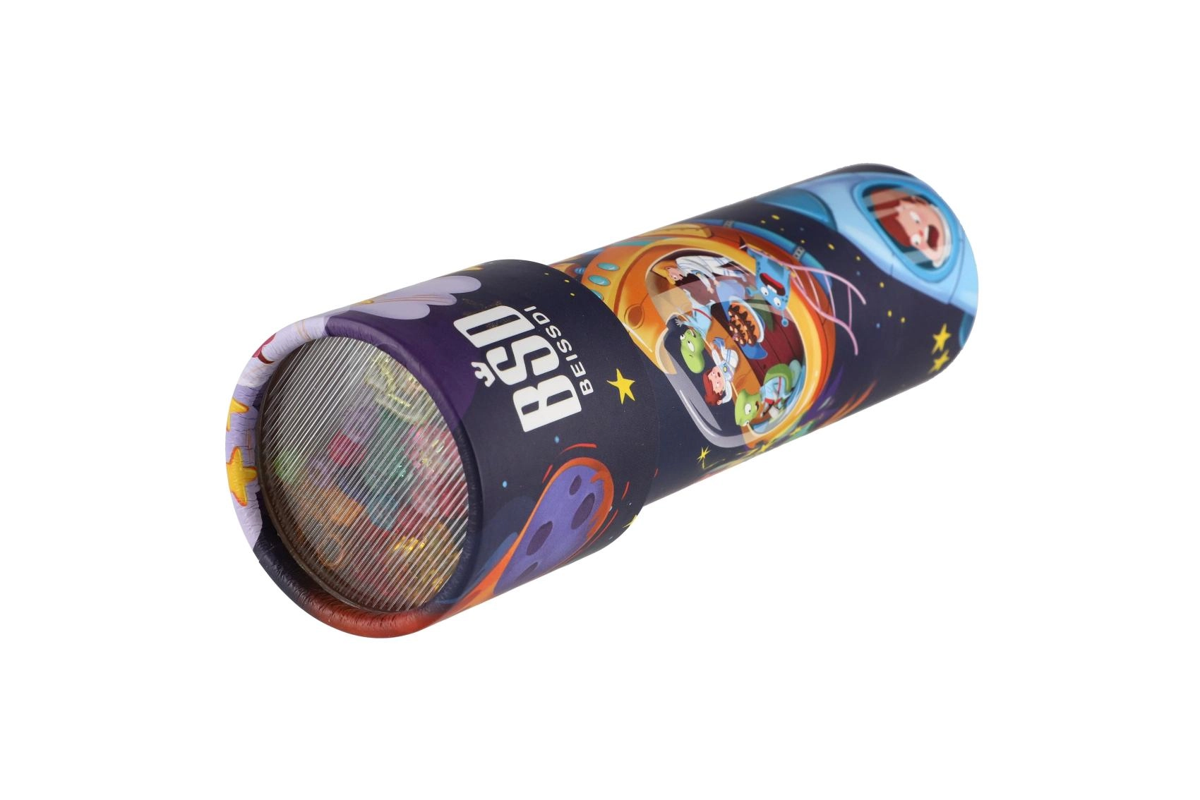 Bij elke draai verschijnen er binnenin de kaleidoscoop nieuwe, kleurrijke en symmetrische figuren die kinderen betoveren en vermaken.