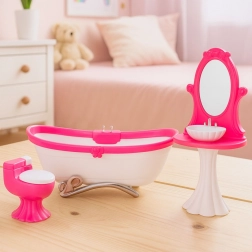 Deze zorgvuldig ontworpen badkamer set laat kinderen scènes uit de badkamer naspelen met maximale fantasie. Het vrijstaande bad, de kaptafel met ovale spiegel en het toilet met openklapbare deksel creëren een authentieke omgeving voor creatief rollenspel en het ontwikkelen van fijne motoriek.