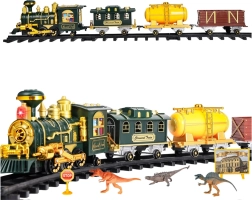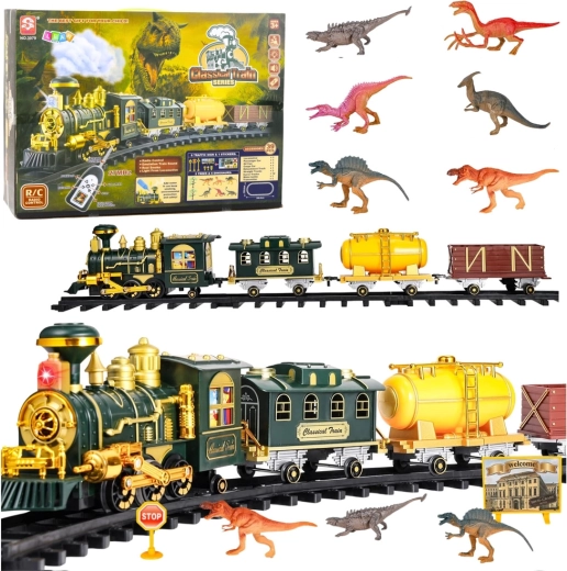 Ontdek een aantrekkelijke treinbaan die de charme van stoomlocomotieven combineert met het avontuur van de prehistorische wereld. Na het bijvullen van water produceert de locomotief realistische rook, met en geluiden van een echte trein. Met de RC-afstandsbediening 27 MHz stuur je eenvoudig zowel richting als snelheid. De set bevat een rijke scène met dinosaurussen, bomen, borden en thematische accessoires voor creatief spel.