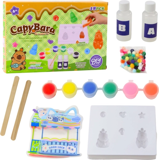 Ontdek een leuke creatieve set waarmee kinderen eenvoudig hun eigen zachte gelfiguurtjes maken in verschillende vormen – van een capibara en een sterretje tot een hart, donut en paddenstoel. Meng gewoon gel A + gel B, voeg pigment toe en giet in de mal. De afgewerkte creaties zijn elastisch, prettig om aan te raken en perfect als anti-stressspeeltje.
