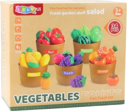 - fruit en groenten (34 stuks), gekleurde mandjes, kunststof mesje, snijplankje, verpakking van de fabrikant