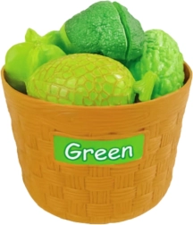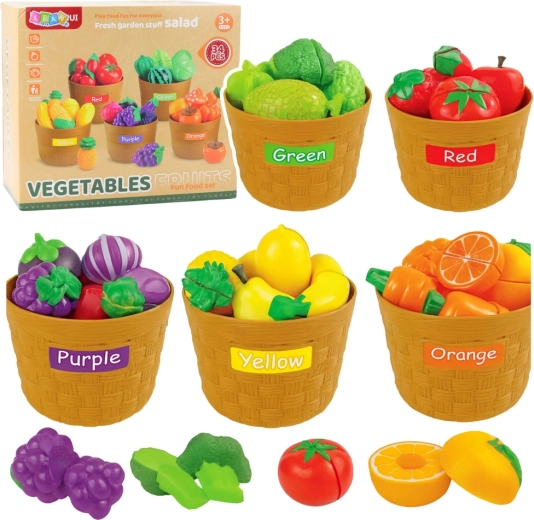 Kleurige educatieve set met 34 delen die kinderen leert kleuren sorteren, categorieën herkennen en basiskeukenvaardigheden. Realistische vruchten van veilig plastic kunnen met klittenbandsluitingen worden “gesneden”; inbegrepen zijn sorteermandjes, een kunststof mesje en een snijplankje. Geweldig voor de ontwikkeling van fijne motoriek, oog-handcoördinatie en creatief spel thuis en in de kleuterklas.