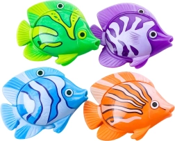 De set bevat vier kleurrijke visjes die goed drijven en in het water makkelijk te zien zijn – ideaal voor spelletjes met snelheid en precisie.